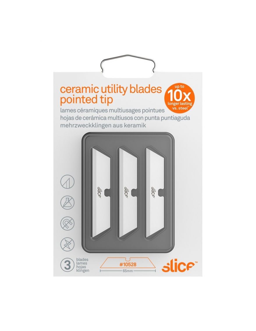 La lame de rechange SLICE 10528 de haute technologie double-sens est aiguisée à la main, et reste aiguisée 10x plus longtemps qu'une lame acier. Elle dispose d'un bout pointu très efficace pour couper les différents matériaux, tout en limitant le risque de coupure de la main !